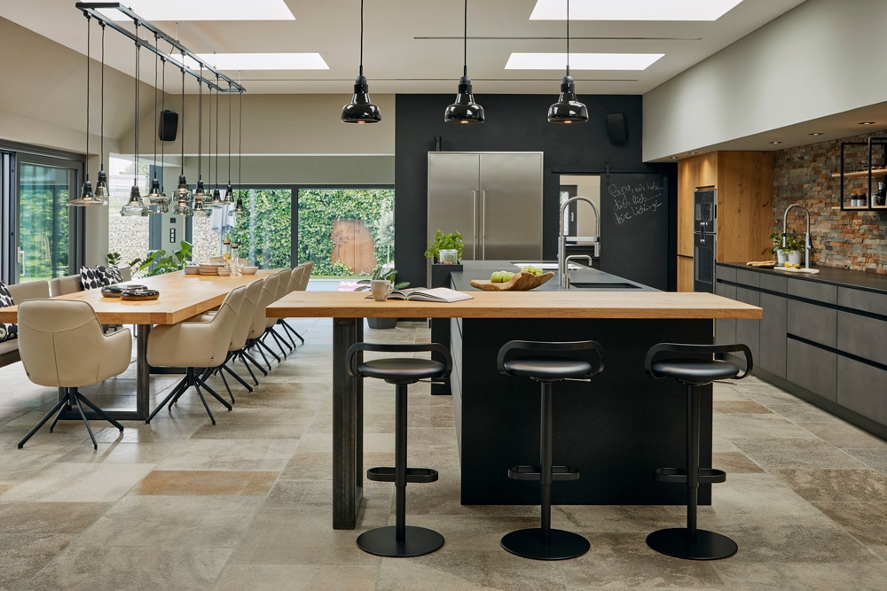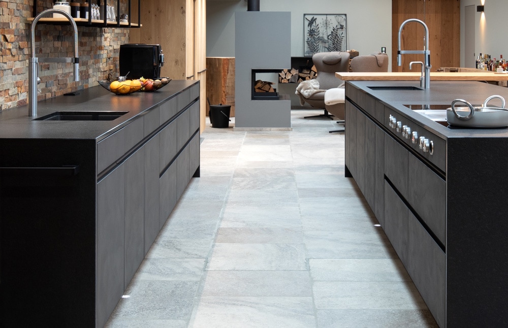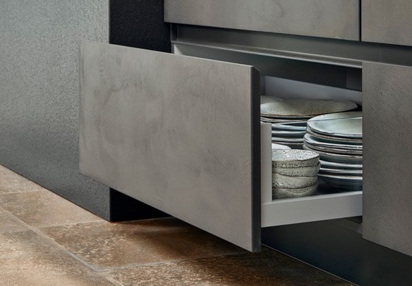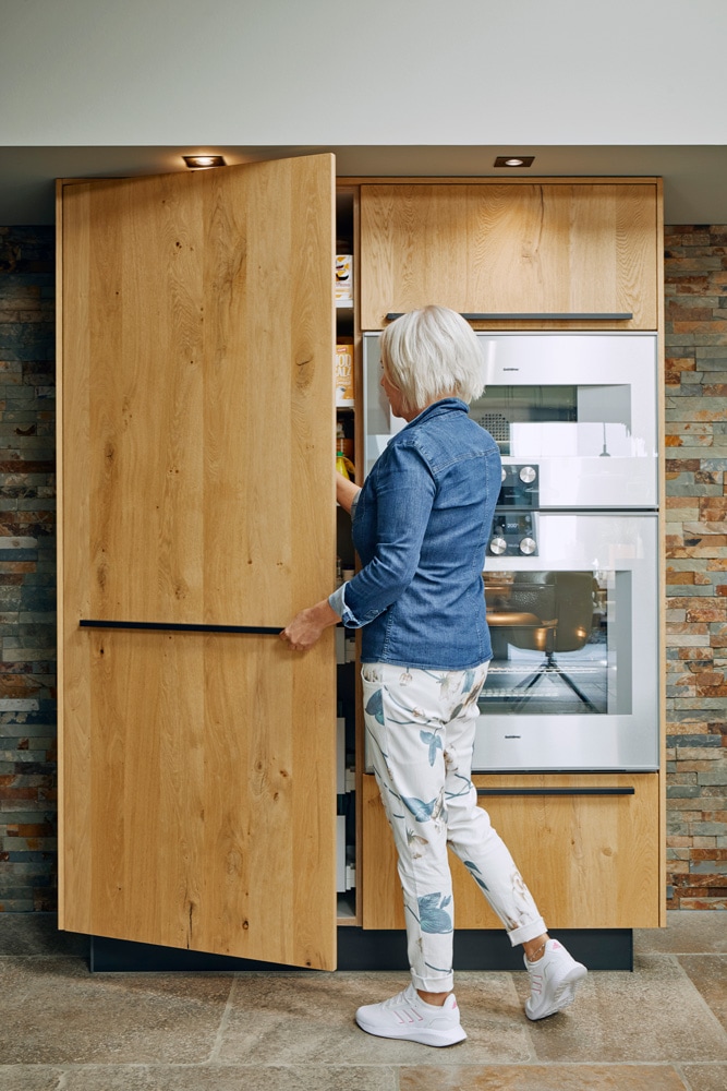 Aber wer kennt nicht das Problem? Mitten in der Vorbereitung – oder beide Hände voll zu tun und dadurch keine mehr frei. Die Antwort: Lichtpunkte am Boden highlighten nahegelegene Mülleimer, die sich hinter den Schrankelementen befinden. Diese sind gut in der gesamten Küche verteilt, um die Wege möglichst gering zu halten.