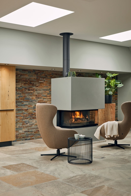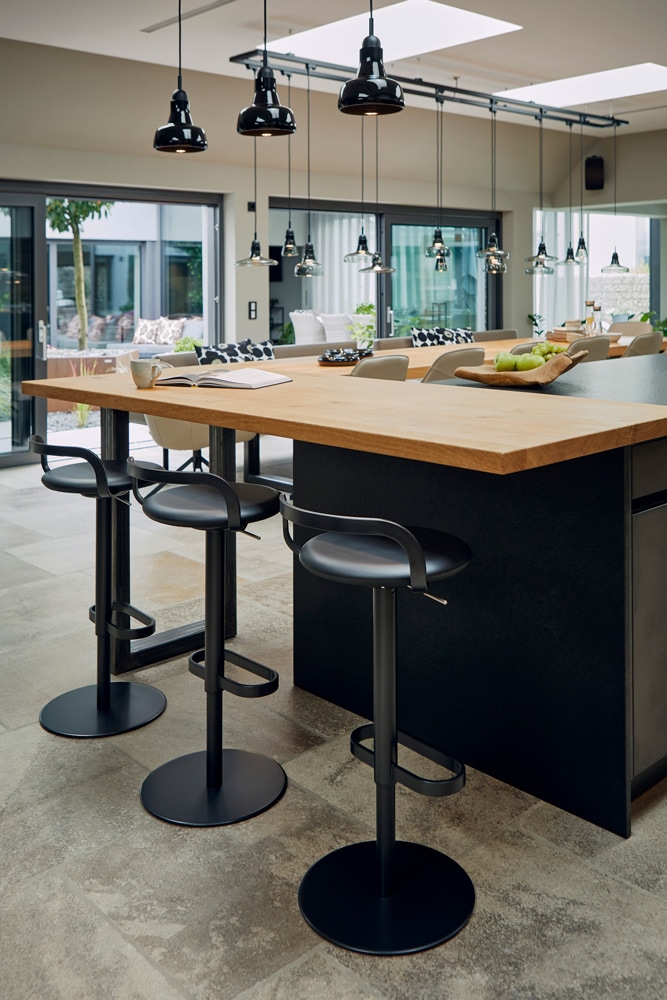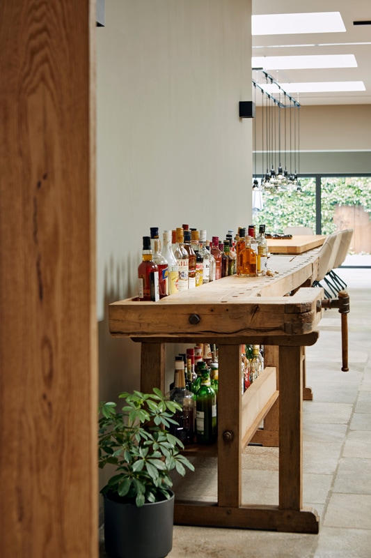 Während wir den Einblick ganz an- und umfänglich mit dem Kamin und der Hausbar begonnen haben, schließt sich hier der Kreis. Denn macht man den Schulterblick in umgekehrter Richtung, so findet sich hier die gesamte Bandbreite hochklassiger und hochprozentiger Spirituosen, eingelassen in die rustikale Werkbank beim Kamin.